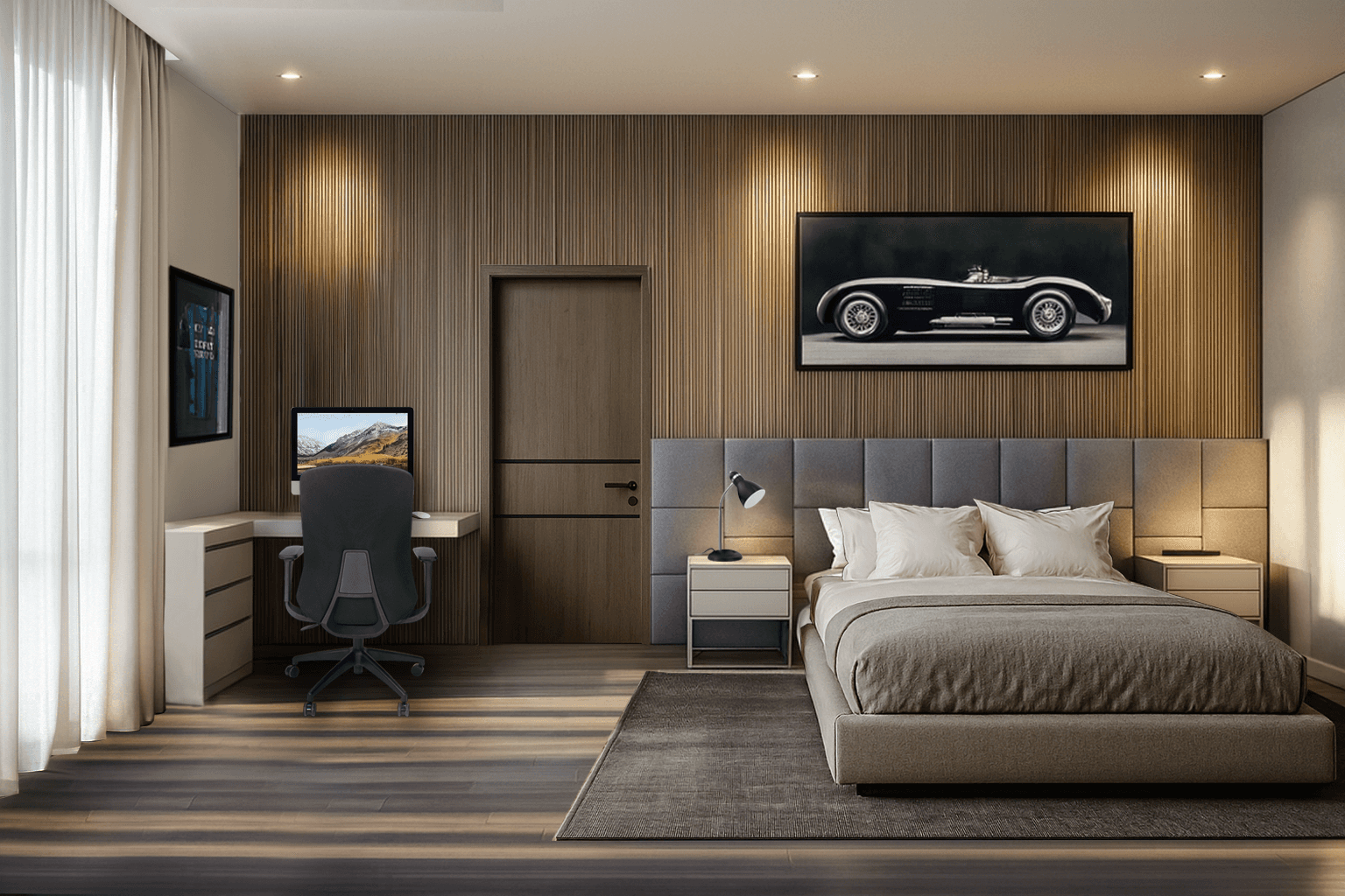 This bedroom project is designed as a contemporary and multifunctional environment, where rest, study, and leisure are seamlessly integrated. The space is defined by clean lines, a neutral palette, and a refined selection of materials that balance warmth with modernity.