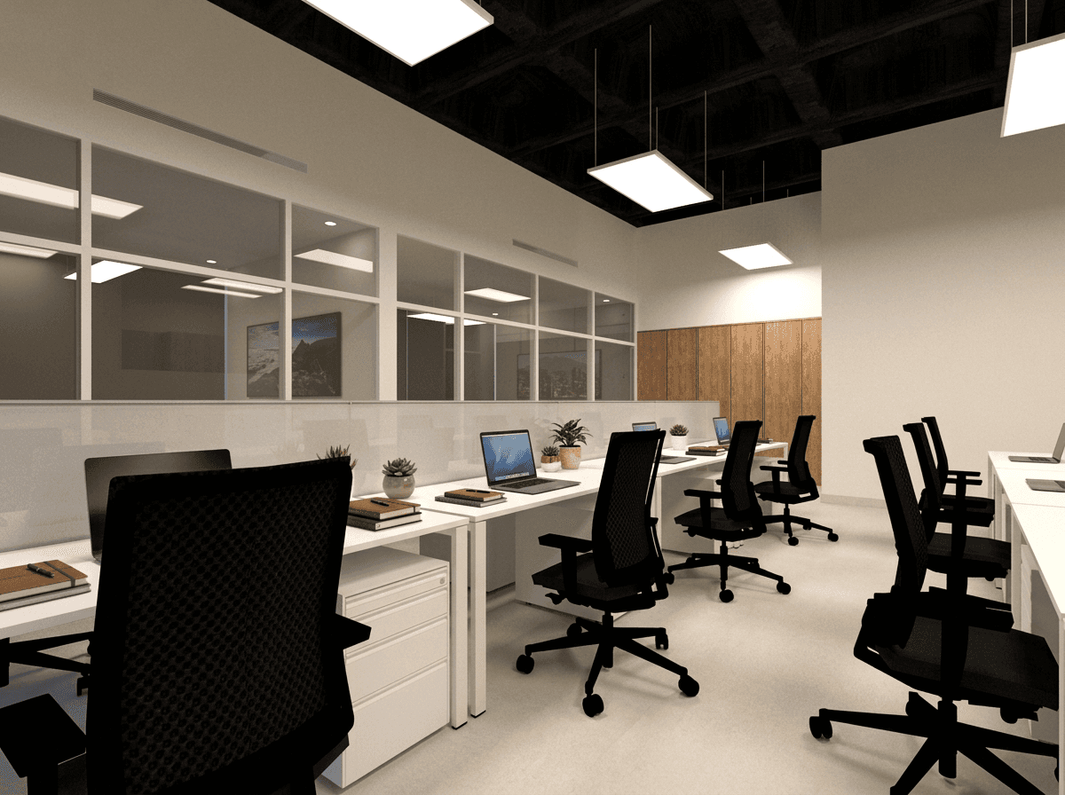 Support areas, including the kitchenette and storage, are seamlessly incorporated through custom millwork, maintaining a clean and cohesive visual language. Every element is designed to optimize functionality without compromising the overall aesthetic.