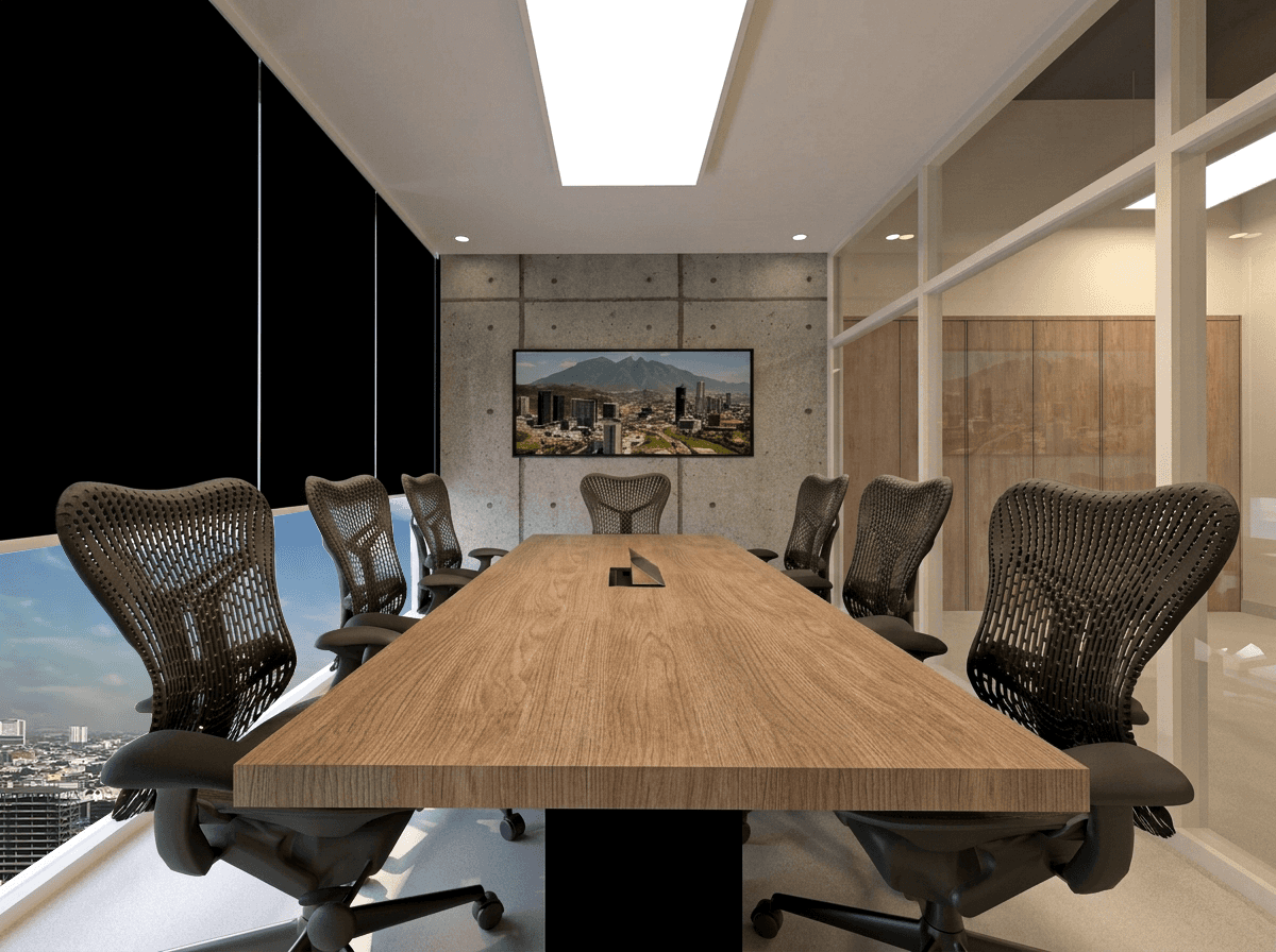 The meeting rooms are conceived as key focal points within the office. A central conference table anchors the space, surrounded by ergonomic seating and framed by panoramic views. Subtle lighting and refined finishes enhance the professional atmosphere, supporting both formal presentations and collaborative sessions.